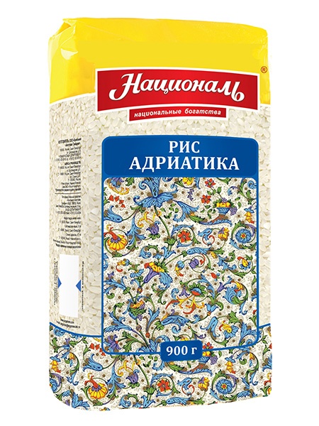 Преобладающий приглушенный и в то же время выразительный синий цвет упаковки ненавязчиво ассоциируется с лазурным итальянским побережьем, с богатой и щедрой кухней этой страны. Рис «Адриатика» — это мягкий сорт риса, круглые зёрна которого способны во время приготовления впитывать вкусы и ароматы всех ингредиентов, составляющих блюдо. Этот рис идеально подходит для приготовления традиционных итальянских блюд: различных гарниров, салатов и десертов.